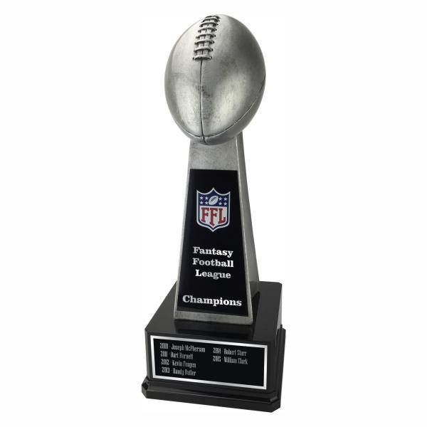 Celebrate your success in fantasy football with this Fantasy Football Championship trophy. This hand-crafted, 17.5" silver-finished resin figurine is a unique addition to your upcoming Fantasy Football awards banquet. The engraved plate on the black base honors yearly fantasy football league winners.