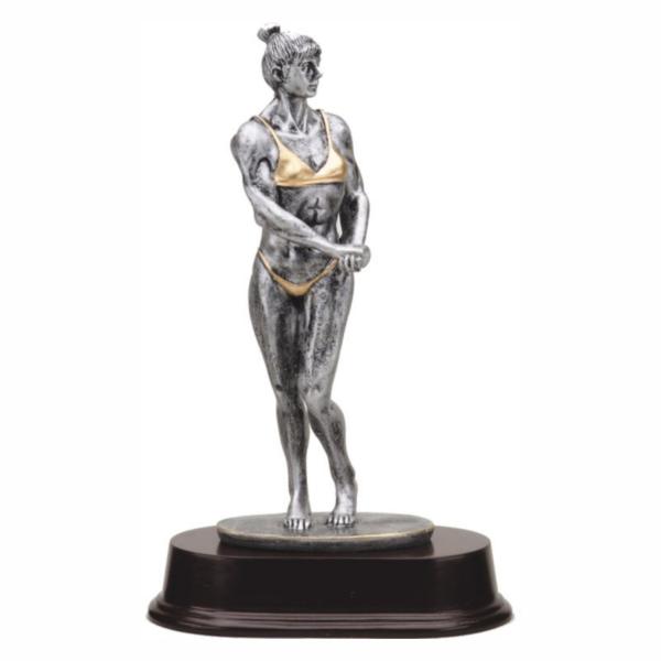 Pewter with gold accents. Celebrate your success in bodybuilding with this Female Bodybuilding Resin trophy. This hand-crafted, 10" figurine is made of pewter-finished resin and features gold highlights, making it a unique addition to your upcoming bodybuilding tournament. The figurine depicts a lifelike Female bodybuilder, and it is placed on an elegant base that comes with a personalization plate.