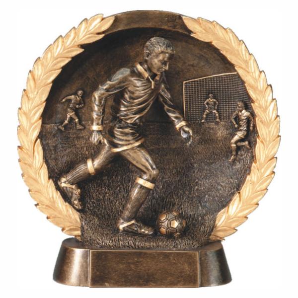 Celebrate your success in soccer with this Male Soccer Wreath Resin trophy. This hand-crafted, 7.5" figurine is made of bronze-finished resin and features gold highlights, making it a unique addition to your upcoming soccer tournament. The figurine depicts a lifelike male soccer player, and it is placed on an elegant base with a personalization plate.